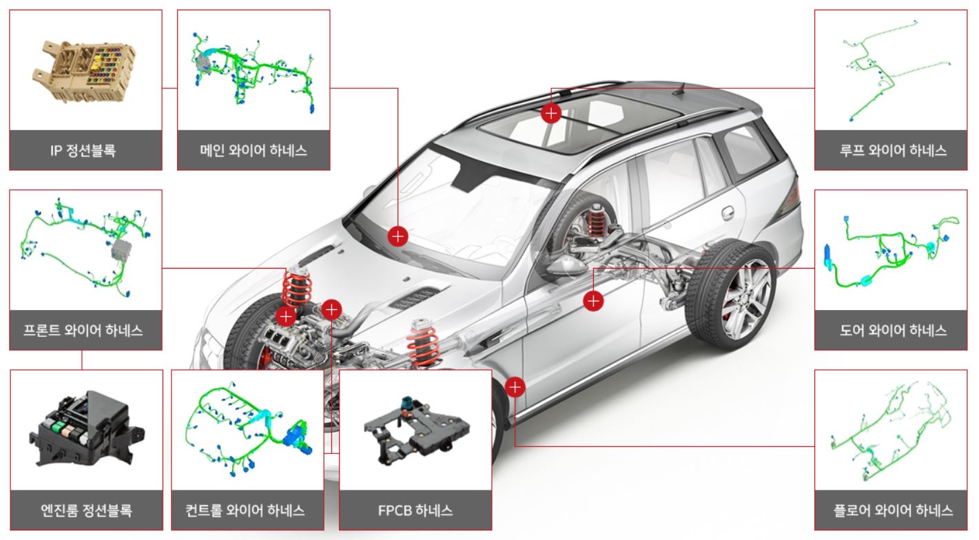 자동차 적용부별 메인 와어어링 하네스(IP정션블록), 프론트 와이어링 하네스(엔진룸 정션블록), 컨트롤 와이어링 하네스, 루프 와이어링 하네스, 도어 와이어링 하네스, 플러어 와이어링 하네스으로 구분됩니다.